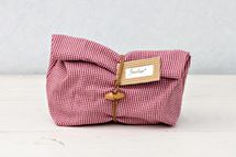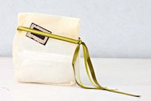 Tee näin: Leikkaa tarlatanista 26x70 cm kappale. Taita kappale pituussuunnassa kaksinkerroin ja ompele sivut. Taita pohjassa kulmiin kolmiot ja ompele 7 cm ommel poikittain kulmiin. Taittele pussin sivut kuten paperipussi. Käännä pussin suu lahjan koon mukaan ja ompele päällekkäin asetellut satiininauhat keskeltä toiseen sivuun päälle sopivalle korkeudelle. Solmi nauhojen päät toiselle sivulle.