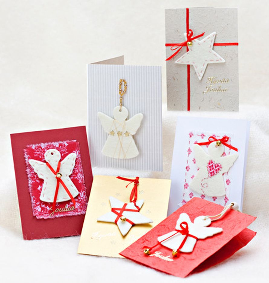 Nyt joulukorttien teko on todella inspiroivaa, sillä askartelutarvikkeista löytyy monenlaisia muunneltavia koristeita, tarroja ja kankaita. Näissä korteissa jouluiloa saajalle tuovat huopaenkeli tai -tähti.