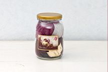 Tee näin: Leikkaa harkkosaksilla noin 3 cm purkin suuta isompia paloja kankaista. Aseta ne purkin suun päälle ja kiedo ympärille pellavanarua.