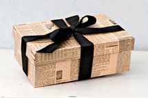 Leikkaa sanomalehdestä kappale, joka riittää molemmille pitkille sivuille ja pohjaan, leikkaa sivut laatikon levyisinä ja lisää 2 cm vain laatikon suulle. Liimaa kiinni lakalla. Tee laatikon kansi samoin. Lakkaa lopuksi laatikko ympäriinsä Decoupage lakalla yhteen tai tarvittaessa kahteen kertaan. Anna kuivua ja solmi ympärille satiininauha.