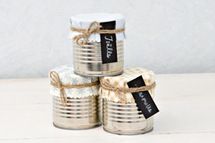 Tee näin: Maalaa purkin kansi kultamaalilla ja anna kuivua. Liimaa purkin kylkeen tarra tai kiiltokuva.