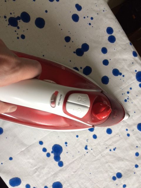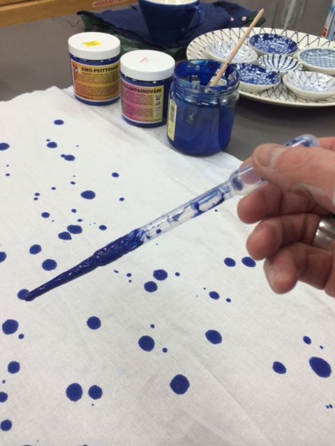 Pellavaliinan roiskekuvio tehtiin pipetillä ruiskien. Huomaa, että eri kankaat imevät väriä eri tavalla.