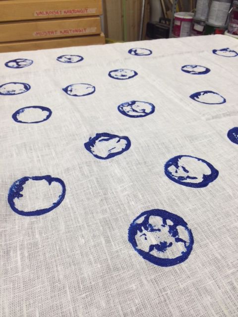 Pullonpohjarenkaat eivät haittaa, kun koko kangas on niiden peitossa. Tyynyliinan pyöreiden kuvioiden leimasimena käytettiin kankaanpainovärin emulsiopulloa.
