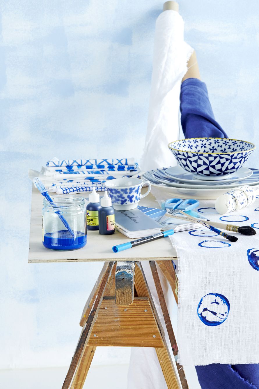 Tämän osaa jokainen: roiski rempseästi, sivele herkin sormin tai taiteile tussilla. Kuvioi kesäpöydän kauneimmat tekstiilit itse.