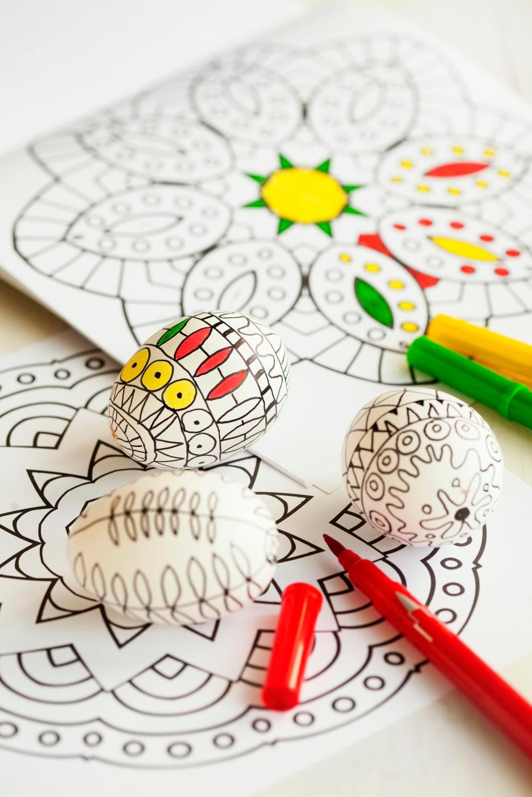 Aikuisten värityskirjojen trendikkäässä hengessä voit tehdä muniin meditatiivisia väritysharjoituksia. Piirrä vedenpitävällä tussilla muniin kuvioita ja kutsu ystävät värittämään.
