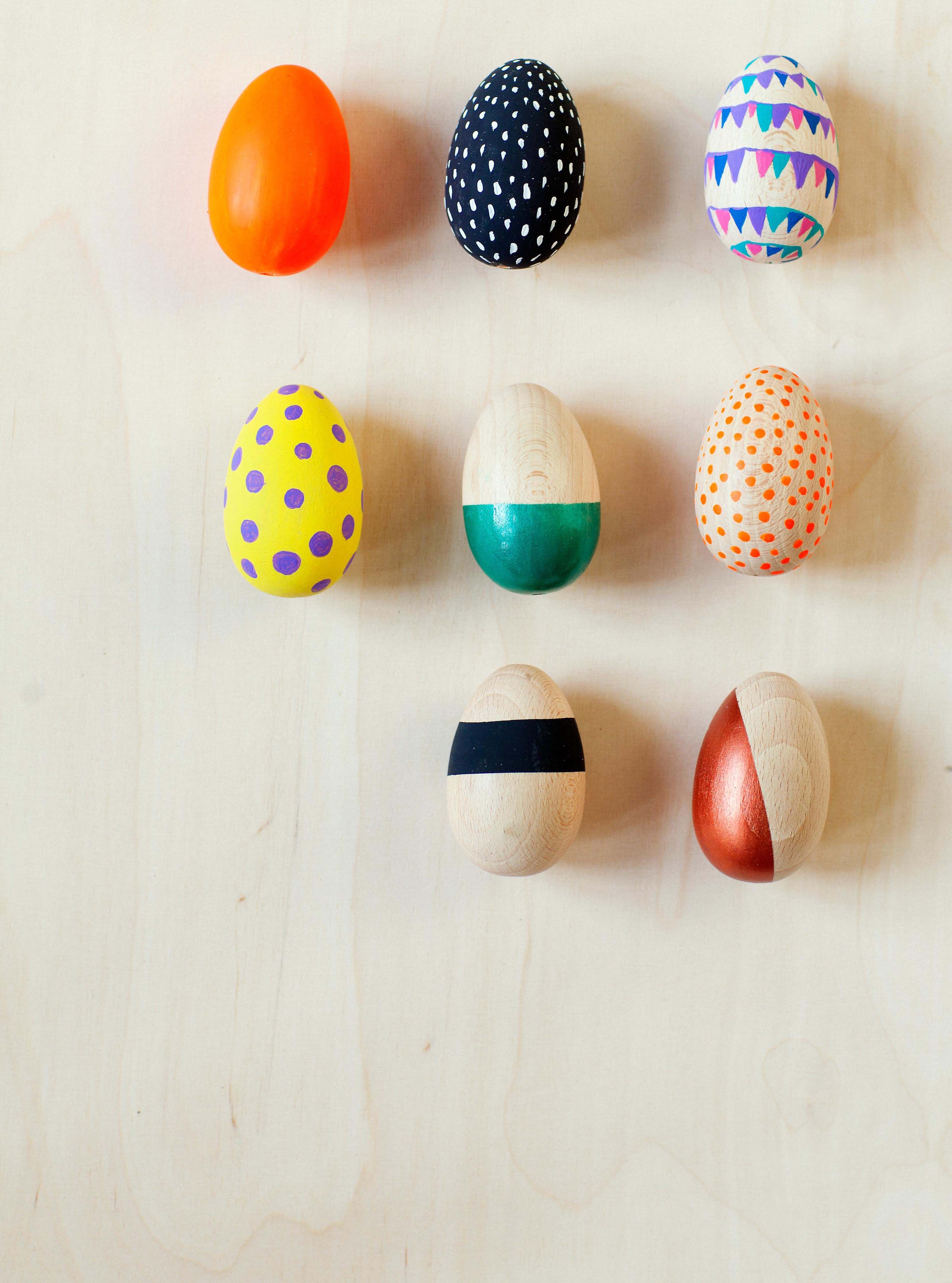 Komeita, aikaa kestäviä koristemunia saat maalaamalla puumuniin selkeitä raitoja ja värialueita.