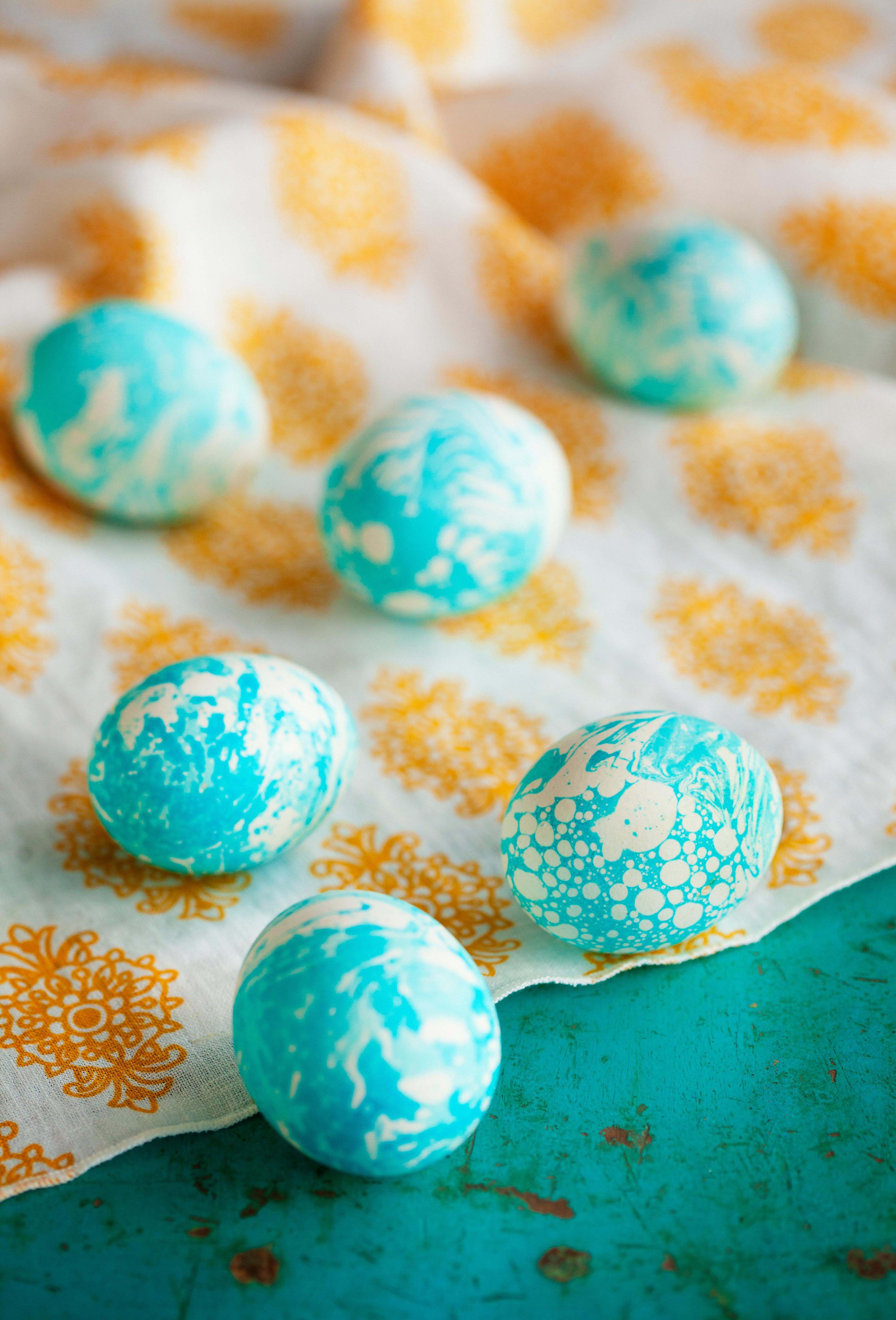 Marmorikuvioiset kananmunat ovat kauniita valkopohjaisina, mutta voit myös ensin pohjamaalata ne.