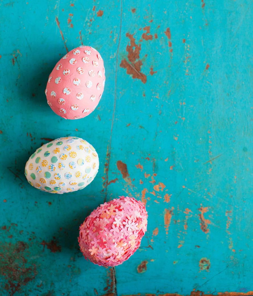 Paperimassamunia voi koristella esimerkiksi liimaamalla niihin paperikoristeita. Maalaa munat ensin haluamasi värisiksi tai jätä ne valkoisiksi.