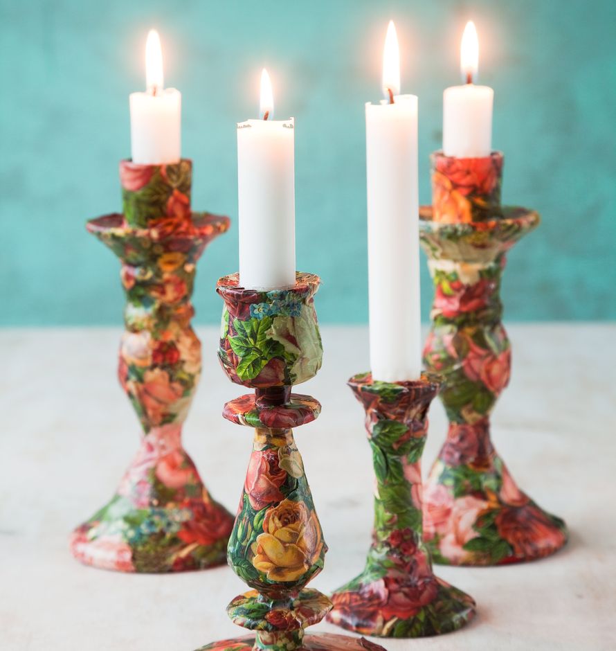 Kynttilänjaloista synty hieno, yhtenäinen ryhmä, kun päällystät ne decoupage-tekniikalla kiiltokuvilla. Siten rumimmatkin kynttilänjalat sopivat toisiinsa.
