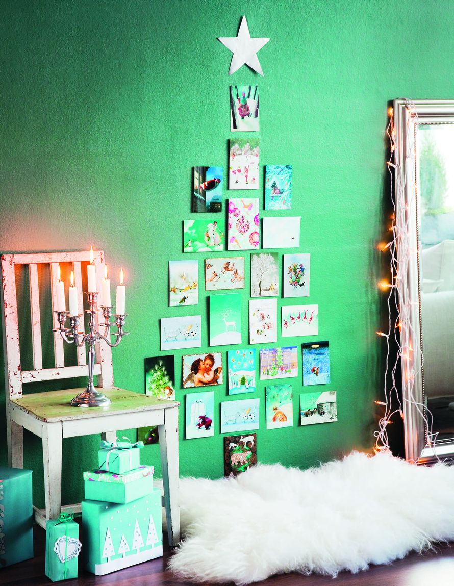 Postin tuomia kauniita joulukortteja ei kannata piilottaa eikä heittää menemään. Kiinnitä ne seinälle kuusen muotoon sinitarralla.