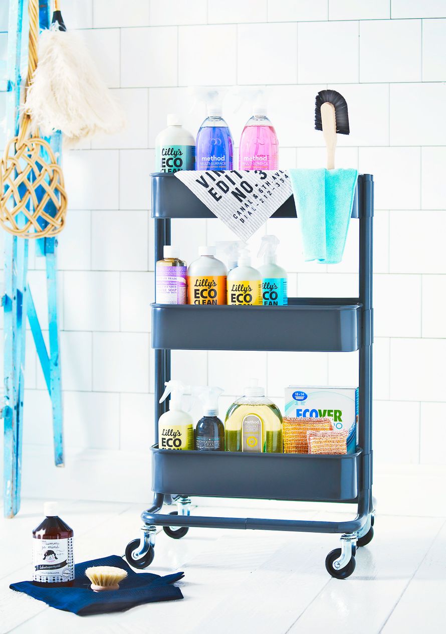 Suunnittele järjestys. Aseta ylähyllylle esimerkiksi kylppärin pikasiivousvälineet. Niitä tarvitset usein. Keskelle sopivat pölynpyyhintätarpeet ja alas lattian- ja ikkunanpesuaineet.