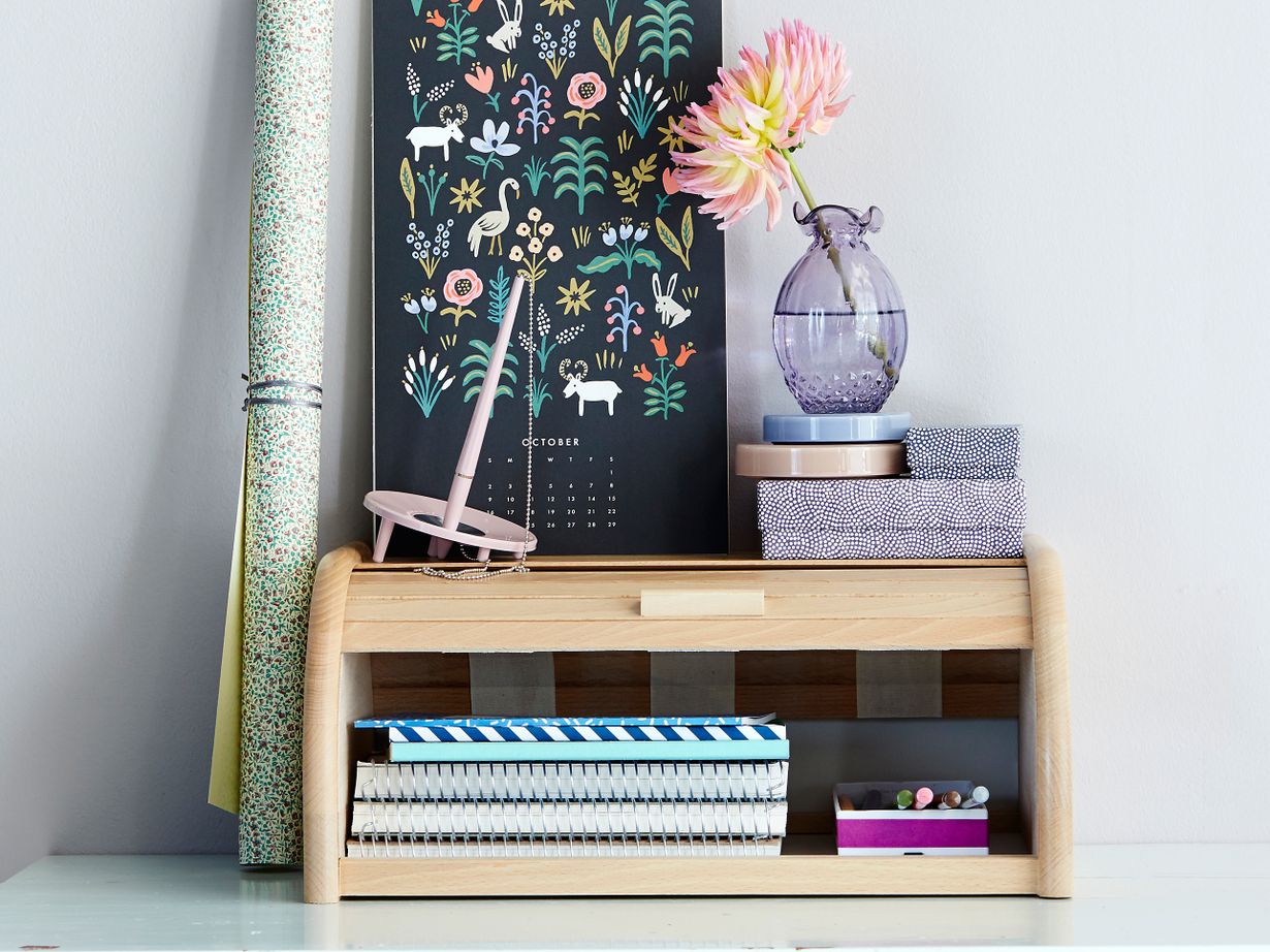 Kuvassa näkyvät tuotteet: Pyökkinen leipälaatikko 29,90 e, Prisma. Kierrevihkot 14 e ja vaaleanturkoosi vihko 8,20 e, Pino. Raitavihko 10,50 e, Paper Shop, ja turkoosi vihko 6,20 e, Viale. Rasia ja kynät kuvausrekvisiittaa. Lahjapaperi 3 e ja seinäkalenteri 27 e, Paper Shop. Kynäteline 21 e, Viale. Kukkamaljakko 7,99 e, H&M Home. Hayn lasirasiat 10 e ja 12,50 e, Viale. Kuviolliset lahjarasiat 5 e ja 7 e, Paper Shop. Lipasto 320 e, Olkkari.