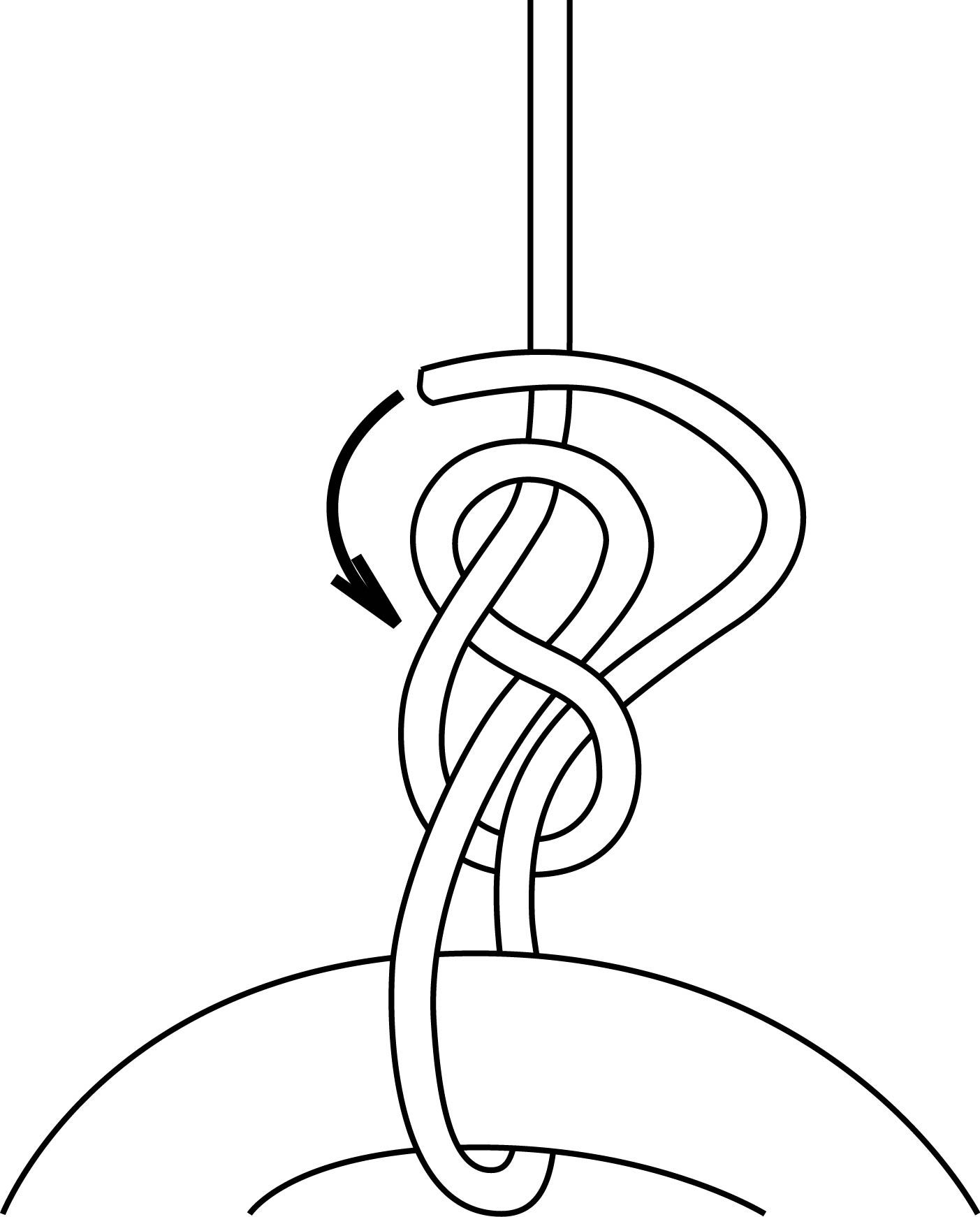 4. Leikkaa nyöri kahteen yhtä pitkään osaan. Solmi nyörien päät amppelin ulkoreunan lenkkeihin kaksinkertaisella kahdeksikkosolmulla piirroksen mukaan: Tee ensin yksi kahdeksikko. Pujota sitten nyöri amppelin ulkoreunan lenkistä ja pujota nyörin pää uudelleen samaa kahdeksikon reittiä. Nyörin pää jää ylös, kiristä solmu ja lyhennä häntä 1,5 cm mittaiseksi. Katso toisen nyörin viimeisen solmun kohdalla, että toisesta nyöristä tulee yhtä pitkä kuin ensimmäisestä.