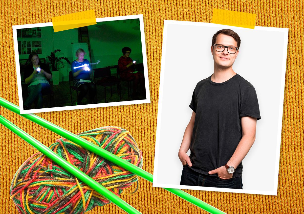 ”Aloimme pohtia, mitä ihan pimeetä voisimme järjestää syysiltoihin. Iloisen ja luovan keskustelun päätteeksi huomasimme, että hohtoneulonnan SM-kilpailu on keksitty!”