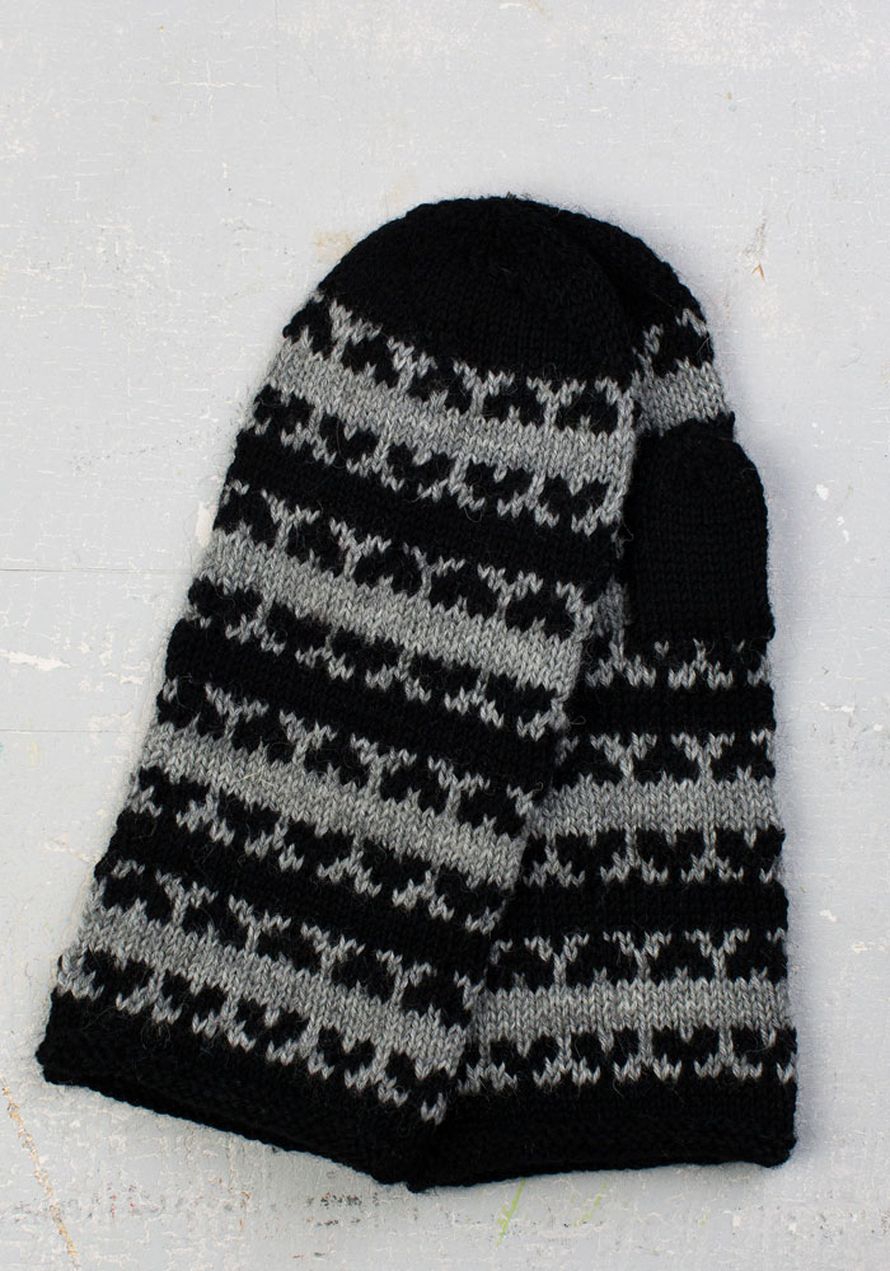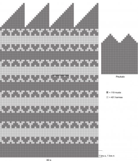 Neulominen: Luo mustalla 60 s ja jaa silmukat neljälle puikolle. Neulo *1 krs o, 1 krs nurin* x 2. Jatka lapasta sileänä neuleena ruutupiirroksen mukaan. Kun olet neulonut sileää 44 krs, ota peukaloa varten 2 s päästä puikon reunasta 10 s apulangalle, luo uudet 10 s ja jatka kirjoneuletta ruutupiirroksen mukaan vielä 28 krs kärjen alkuun saakka. Aloita kärkikavennukset. Kavenna joka kerroksella neuloen joka puikon lopussa 2 s oikein yhteen. Kun jäljellä on 4 s, vedä lanka niiden läpi ja kiristä. Neulo toinen lapanen peilikuvaksi.