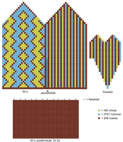 Neulominen: Luo ruskealla 42 s ja neulo 2n 2o joustinneuletta 23 krs. Lisää joustimen viimeisellä kerroksella tasavälein 12 s (yht. 54 s). Aloita kirjoneule piirroksen mukaan, samoin peukalokiila. Kun kiila on valmis, ota peukalon silmukat apulangalle ja luo tilalle 1 s. Jatka kirjoneuletta lapasen suora osuus loppuun.