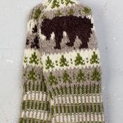 Jatka neulomista ruutupiirroksen mukaan 32 krs. Ota peukaloa varten 9 s apulangalle. Luo uudet silmukat ja jatka kirjoneuletta 28 krs.