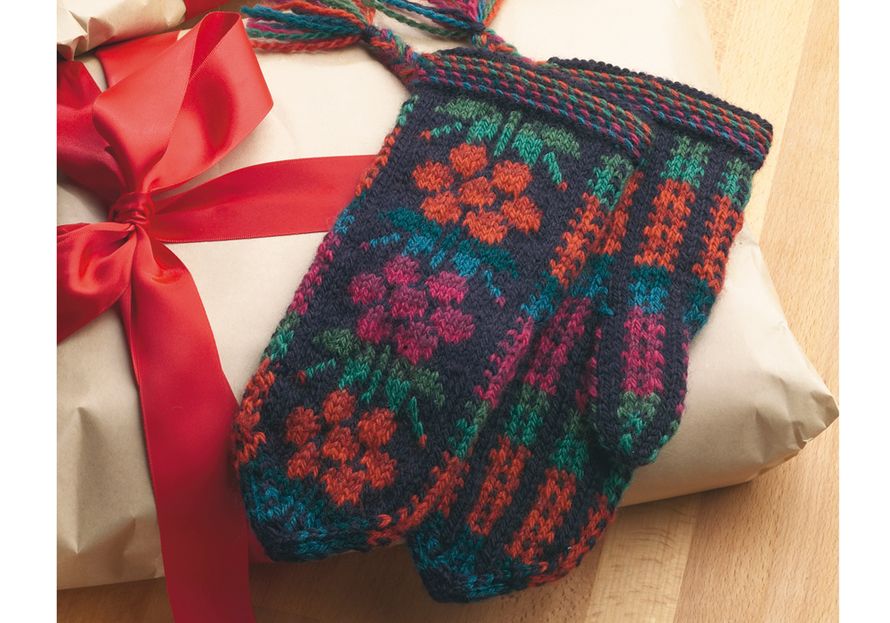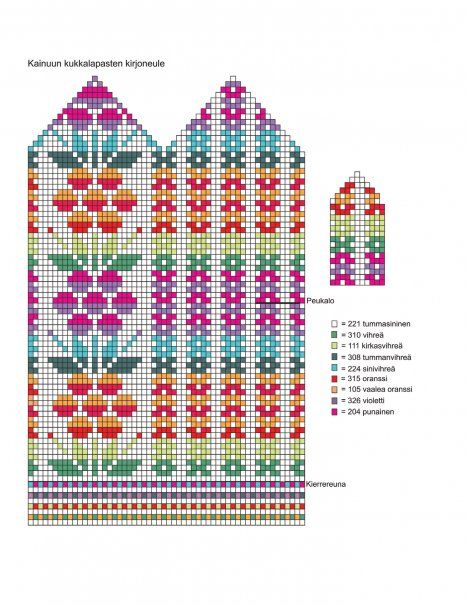 Peukalo: Ota apulangalta s:t puikolle, poimi s:t luotujen silmukoiden reunasta ja peukaloaukon kummastakin reunasta = 19–21 s. Jaa ne kolmelle puikolle ja neulo kämmenen kirjoneuleen mukaan 5 cm. Kavenna sitten joka puikon lopussa 2 s o yhteen joka kerroksella. Kun jäljellä on 3 s, vedä lanka niiden läpi. Neulo toinen lapanen peilikuvaksi.
