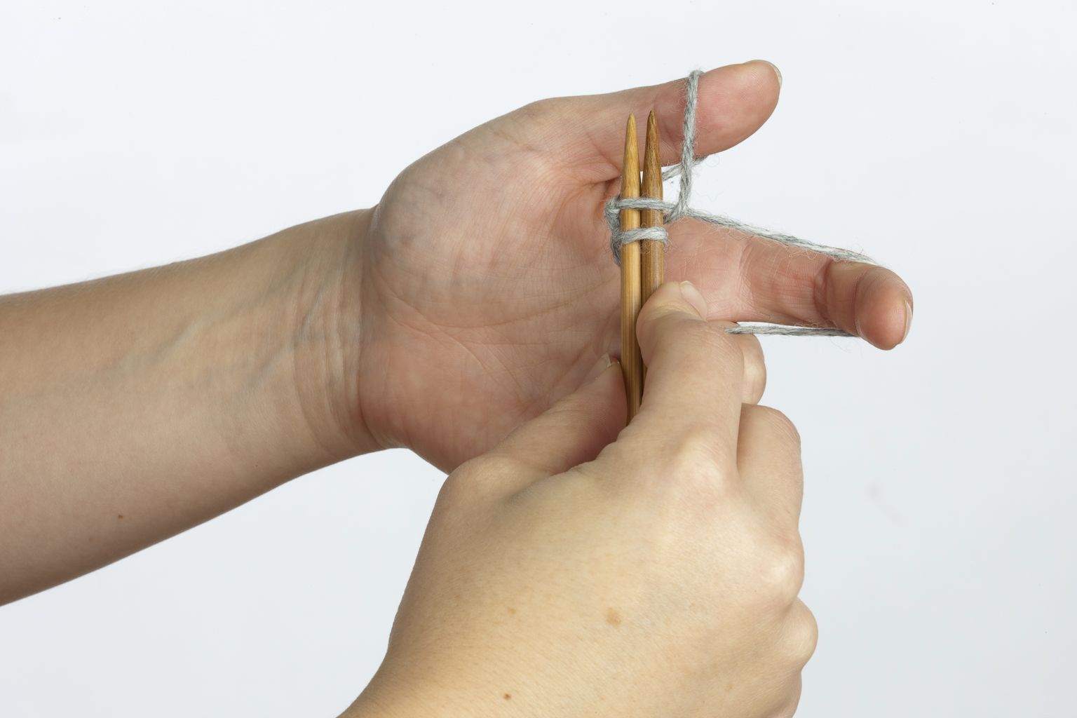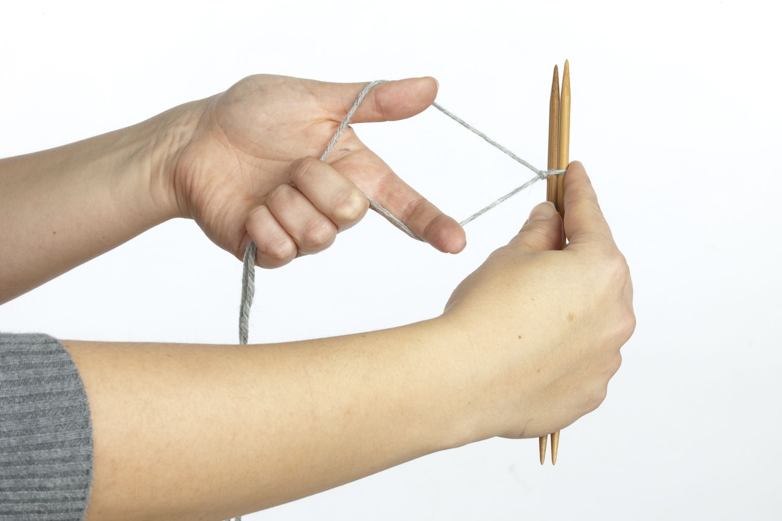 5. Tuo etusormen lanka peukalon lankalenkistä. Päästä peukalon lenkki ja kiristä silmukka puikolle.