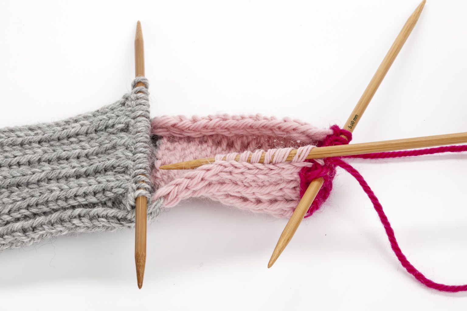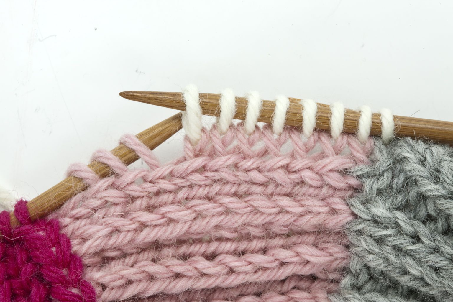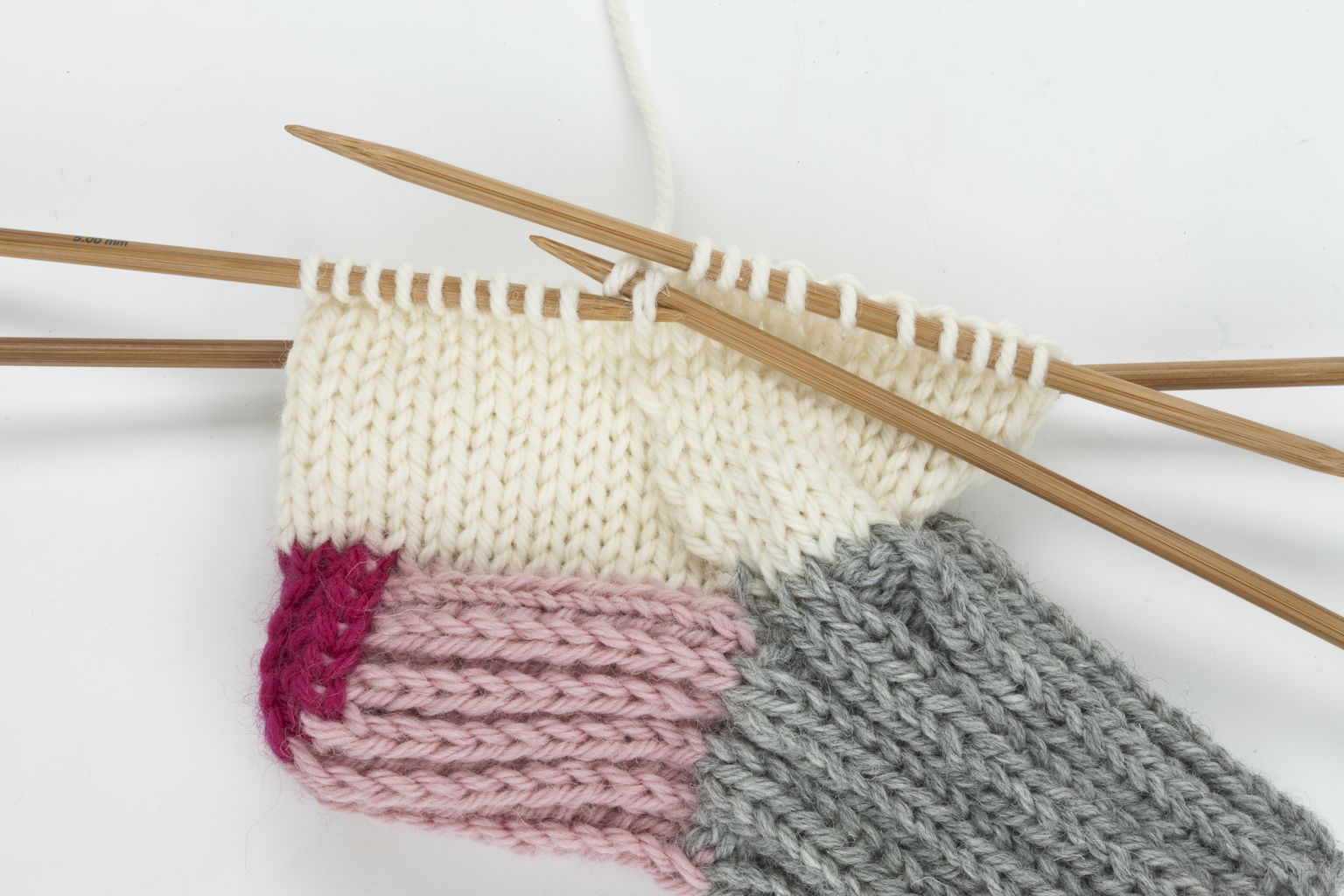 3. Neulo poimitut silmukat kiertäen, jottei reunaan tule reikiä. Neulo 2. ja 3. puikon silmukat normaalisti oikein.