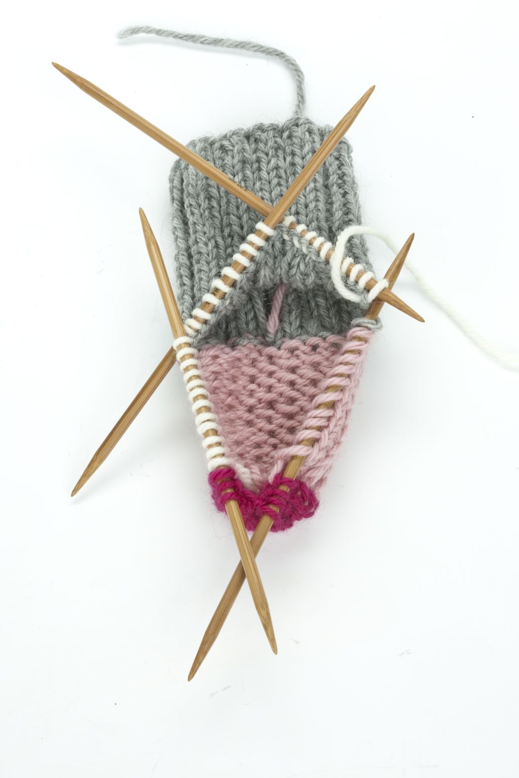 4. Työssä on 1. ja 4. puikolla enemmän silmukoita kuin työn alussa. Ne kavennetaan pois. Neulo 1. puikon silmukat oikein, kunnes puikolla on 2 silmukkaa. Neulo silmukat oikein yhteen.