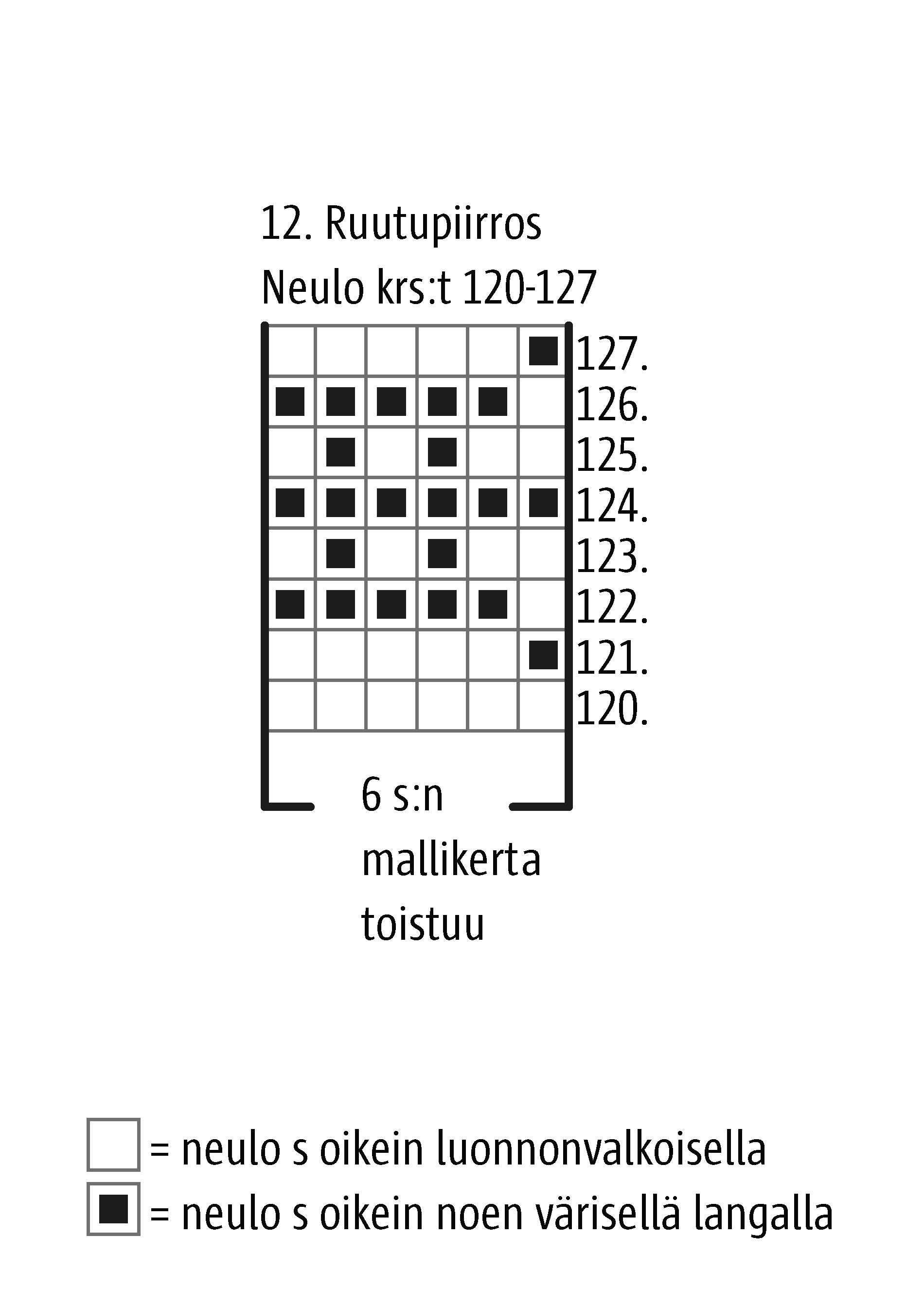 Jatka kirjoneuletta 12. ruutupiirroksen 120. krs:lta ja toista 6 s:n mallikerta 10 kertaa. Neulo krs:t 121–127.