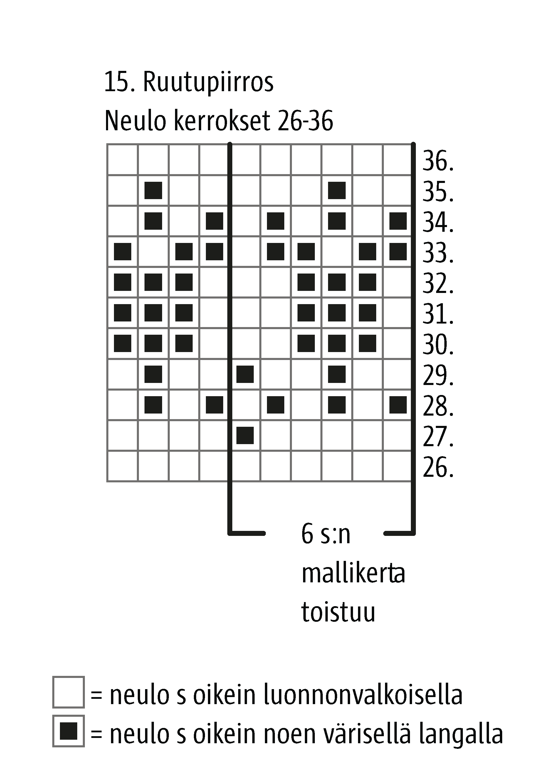 Jatka kirjoneuletta 15. ruutupiirroksen 26. krs:lta seuraavasti: Tee krs:n alussa ylivetokavennus, neulo kerrosta, kunnes jäljellä on 2 s ja neulo 2 o yht. Krs:lla kaventui 2 s ja työssä on nyt 76 s. Neulo krs:t 27–36: Toista 6 s:n mallikerta 12 kertaa ja neulo vielä vasemman reunan 4 s.