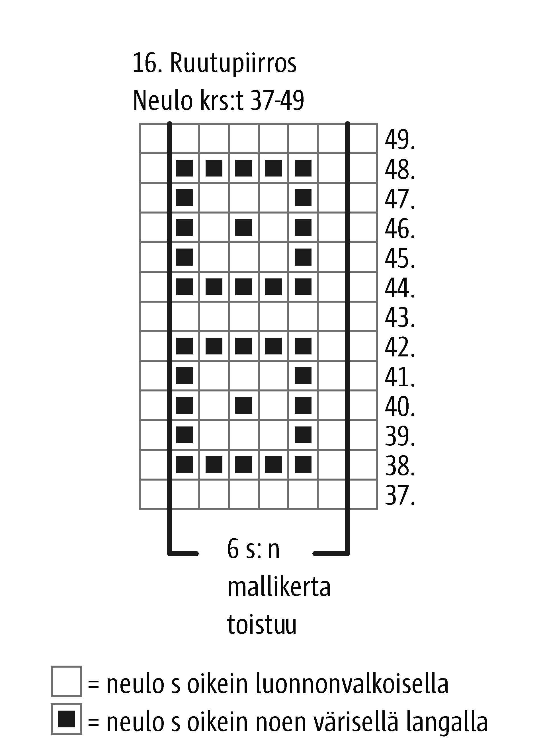 Jatka kirjoneuletta 16. ruutupiirroksen 37. krs:lta ja kavenna krs:n alussa ja lopussa 1 s kuten krs:lla 26. =74 s. Neulo krs:t 38–49: Neulo oikean reunan 1 s, toista 6 s:n mallikerta 12 kertaa ja neulo vielä vasemman reunan 1 s.