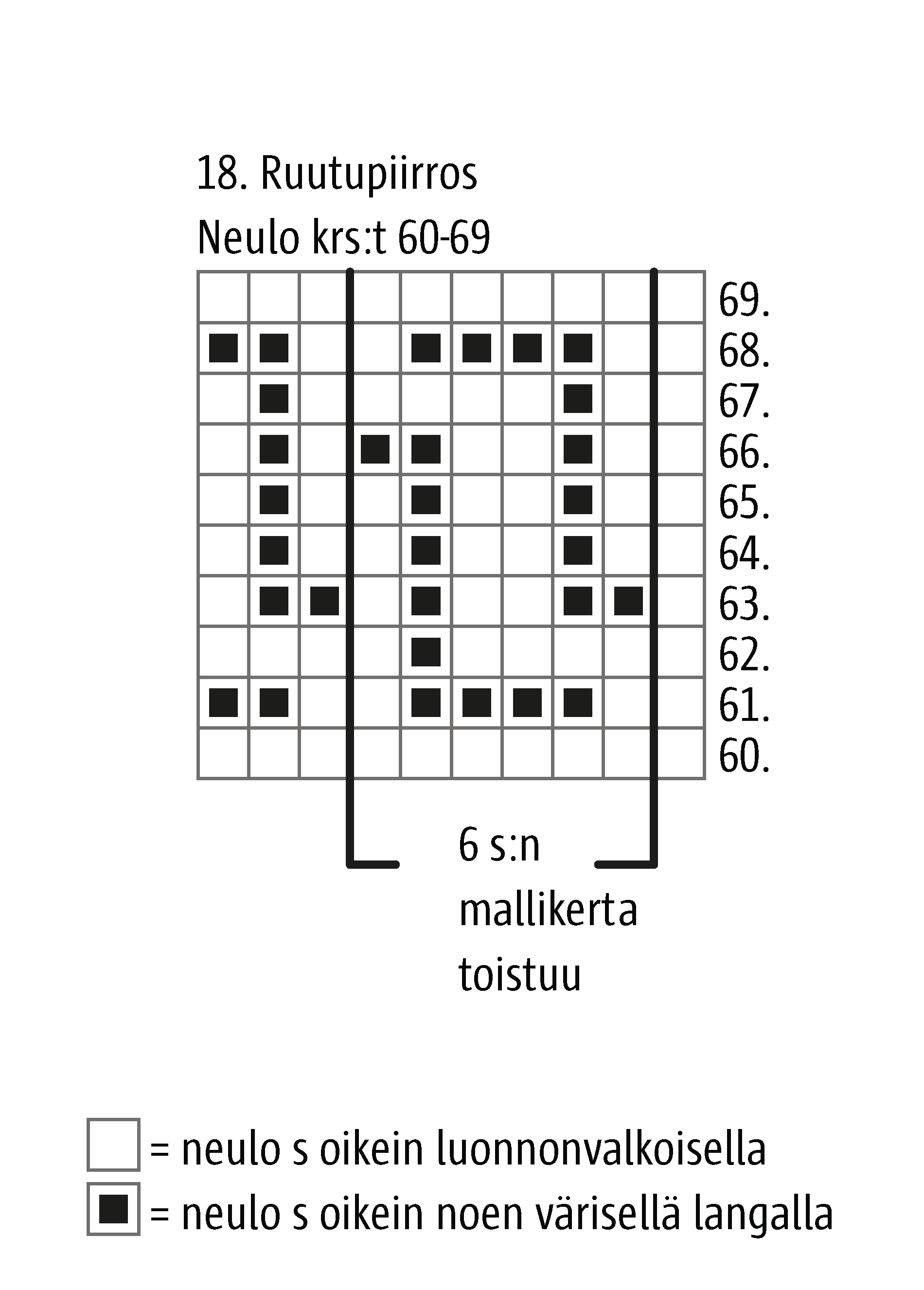 18. luukku tulee tässä: Jatka kirjoneuletta 18. ruutupiirroksen 60. krs:lta ja kavenna krs:n alussa ja lopussa 1 s kuten krs:lla 26. =70 s. Neulo krs:t 61–69: Neulo oikean reunan 1 s, toista 6 s:n mallikerta 11 kertaa ja neulo vielä vasemman reunan 3 s.
