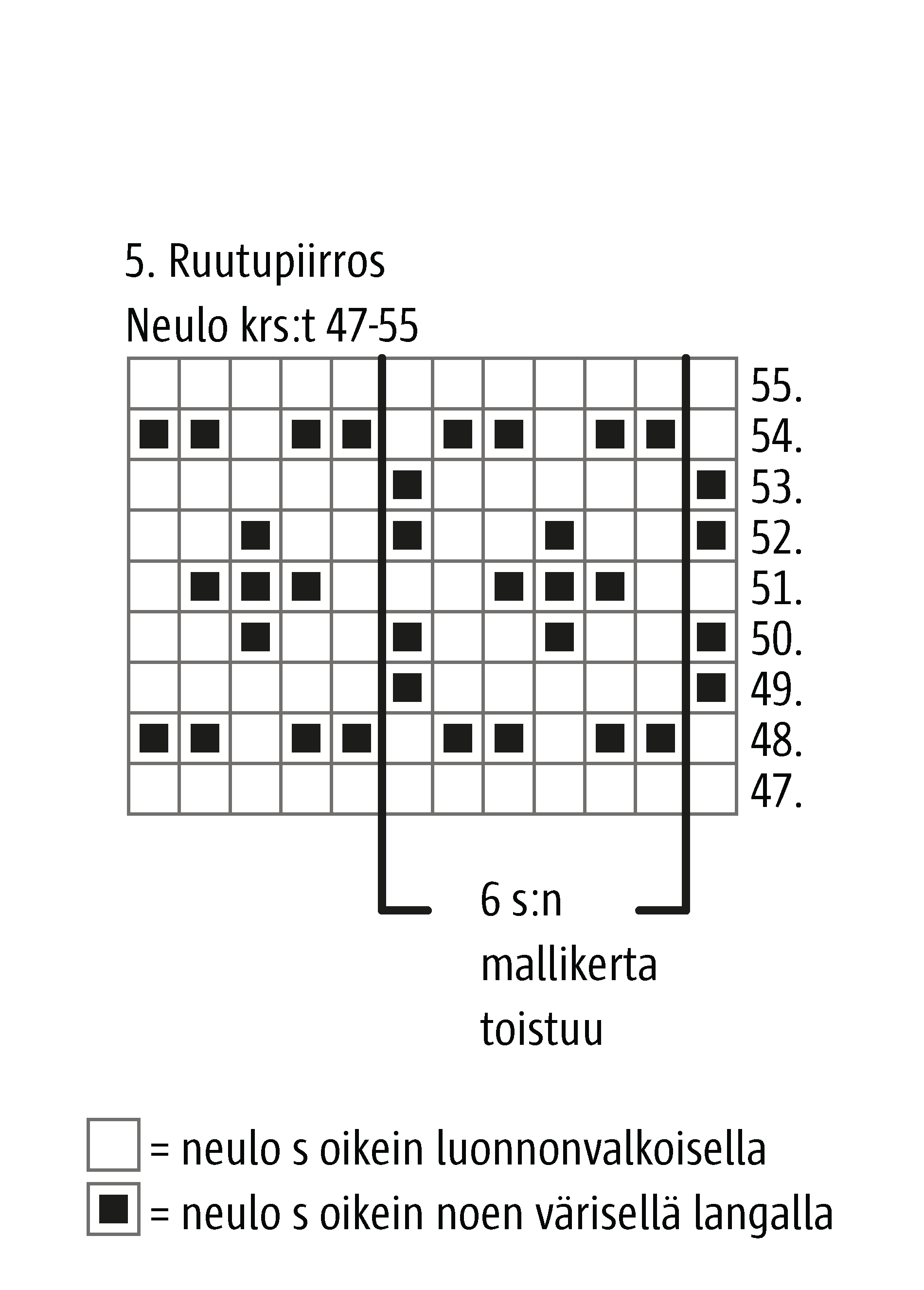 Jatka kirjoneuletta 5. ruutupiirroksen 47. krs:lta ja kavenna krs:n alussa ja lopussa 1 s kuten krs:lla 26. =72 s. Neulo krs:t 48–55: Neulo oikean reunan 1 s, toista 6 s:n mallikerta 11 kertaa ja neulo vielä vasemman reunan 5 s.