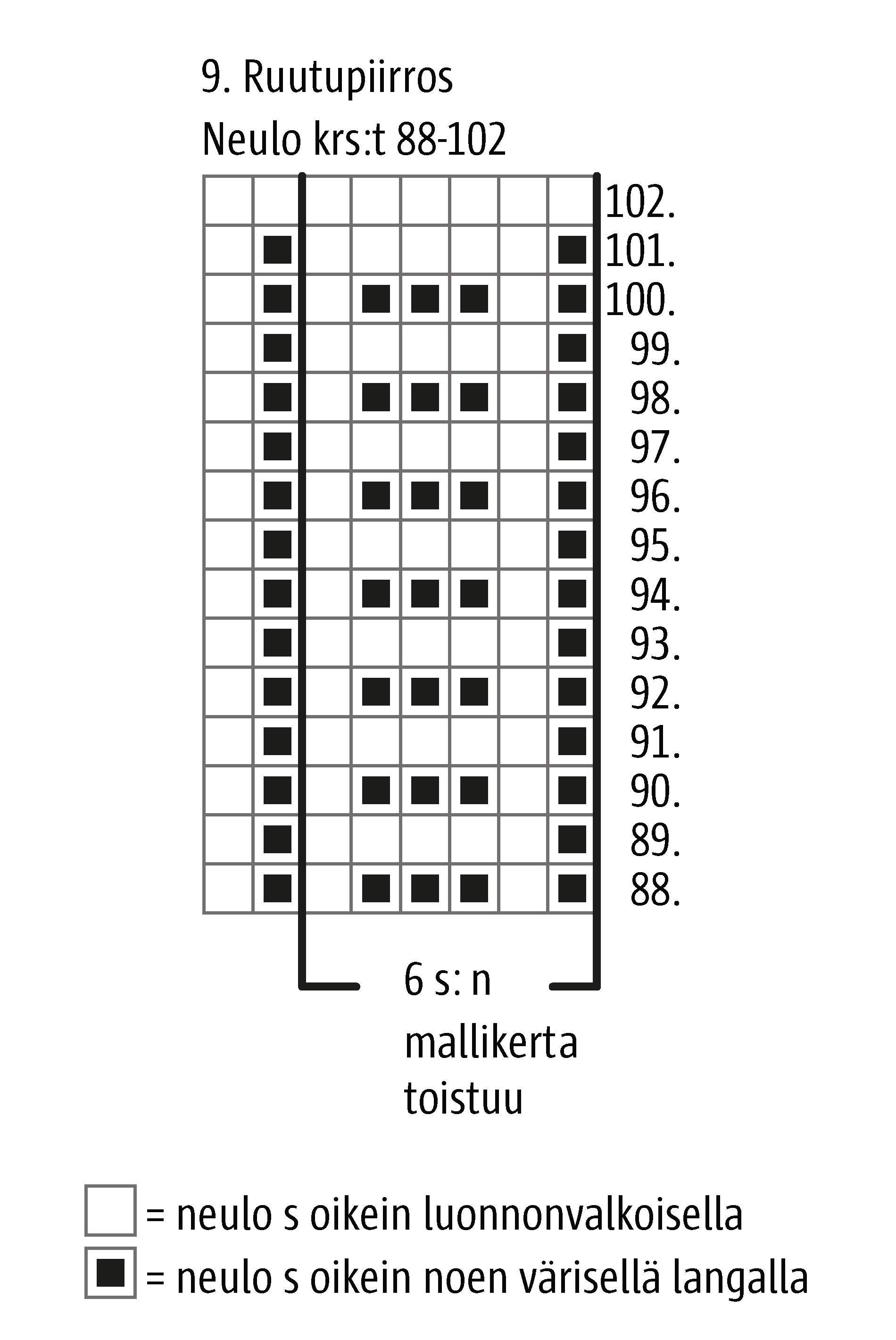 Jatka kirjoneuletta 9. ruutupiirroksen 88. krs:lta ja toista 6 s:n mallikerta 12 kertaa ja neulo vielä vasemman reunan 2 s. Neulo 89. krs ja aloita kiilakavennukset: Neulo I puikon lopussa 2 viimeistä s:aa oikein yhteen ja tee IV puikon alussa ylivetokavennus. Neulo krs:t 90–102 ja toista kavennukset joka 2. krs, kunnes joka puikolla on jäljellä 15 s.