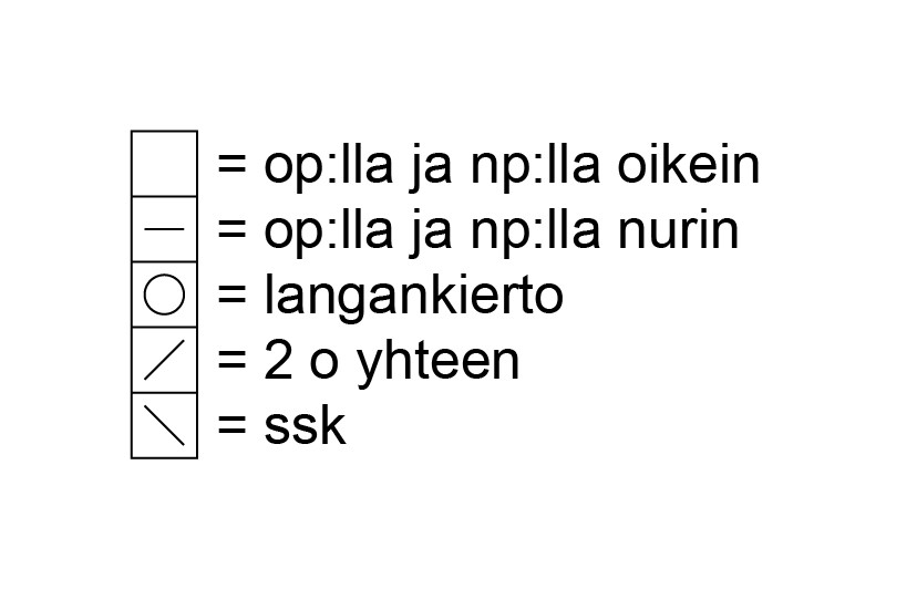 2. krs: Nosta 1. s neulomatta, 3 o, *8 n, 8 o*, toista *-* vielä 6 kertaa, 3 o. Jatka neulomalla 3.-14. krs:t kaavion mukaan.