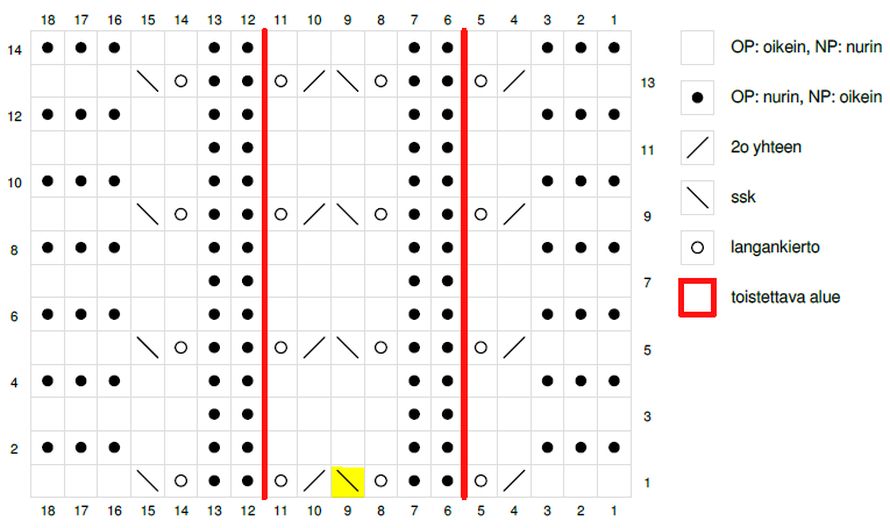 Mysteerineulehuivin osan 1 kaaviosta puuttui yllä olevassa kuvassa keltaisella korostettu ssk-merkki riviltä 1, sarakkeesta 9.