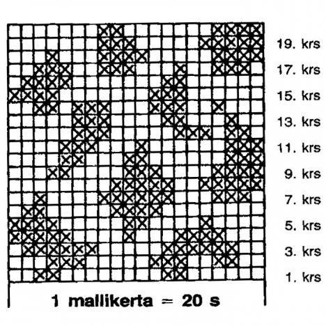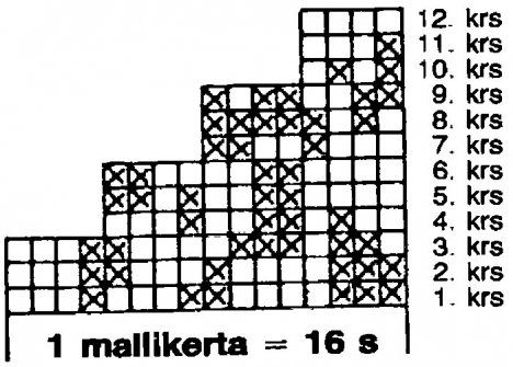 Jatka kuvion neulomista piirroksen 2 mukaan ja neulo joka 4. ja 5. s o yhteen. Kavenna vielä joka 3. krs:lla 3 x. Neulo ensin joka 3. ja 4. s yhteen, seuraavalla kavennuskrs:lla 2. ja 3. s yhteen ja viimeisellä kavennuskrs:lla aina 2 s o yhteen. Neulo 2 krs:ta kaventamatta ja kiristä langalla yhteen loput 24 s.