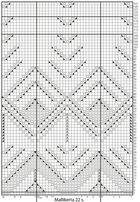 Takakappale: Luo 113(127)145(157)171 s, neulo sitten ruutupiirroksen mukaista joustinta (piirroksen alin ruuturivi) aloittaen 1 reuna-s:n (= rs) sisällä piirroksen oikean reunan silmukasta 1(5)7(1)5 ja neulo silmukkaan 11 saakka. Toista sitten 22 s:n mallikertaa 4(5)6(6)7x ja neulo vielä alkua vastaavat s:t mallikerran lopusta vasemmalle ja viimeiseksi 1 rs. Toista kerroksia 1 – 2 yhteensä 40 krs, jatka 1 rs:n sisällä pitsineuletta ja aloita samasta kohdasta kuin joustin.