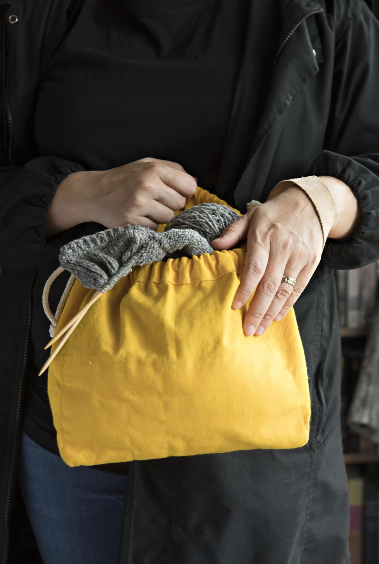 Keskeneräiset työt kulkevat Liinan mukana kankaisissa projektipussukoissa. Vapaa-ajan lisäksi ne pääsevät mukaan työpaikalle teknologiayritykseen.