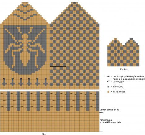 Neulominen: Luo 2½ puikoilla ruskealla 60 s ja jaa silmukat neljälle puikolle. Neulo 6 krs sileää ja seuraavaksi nirkkoreuna * 2 s oikein yhteen, langankierto* jatka koko krs *-*. Neulo 6 krs sileää ja yhdistä seuraavalla kerroksella aloitusreunan silmukat neulomalla ne yhteen puikolla olevien silmukoiden kanssa. Vaihda no 3 puikot ja aloita varren joustinneule kirjoneuleena piirroksen mukaan. Neulo varren osuudella 4 o ruskealla 2 n mustalla. Neulo palmikot merkittyihin paikkoihin.