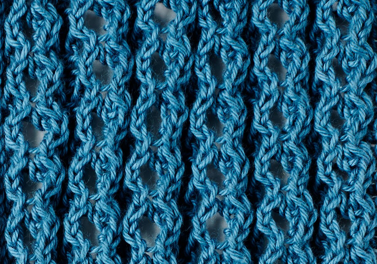 Pystysuuntaisilla reikäjonoilla kuvioitu pitsi on jaollinen kuudella silmukalla ja se muodostuu neljästä kerroksesta. Neulo sitä näin: