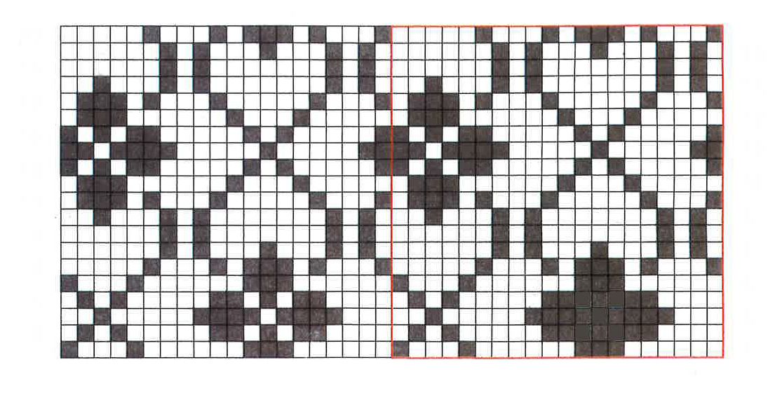 Reuna: Kierrä reunassa langat toistensa ympäri, jolloin molemmat langat sitoutuvat kappaleen reunassa ja kuvio ei vedä keskelle päin.