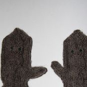VIIMEISTELY: Ompele kuono paikoilleen (voit laitaan kuonon alle palan vanua täytteeksi, jos haluat sen olevan kohollaan). Kirjaile mustalla langalla silmät, nenä ja viikset. Ompele peukalon vinot sivut lapasen reunoihin heti joustinneuleen jälkeen. Ompele lapasen sauma. Kierrä lopuksi 1 metsin mittainen nyöri sinisestä langasta ja kiinnitä lapaset sen päihin, jotta ne pysyvät paremmin tallessa.