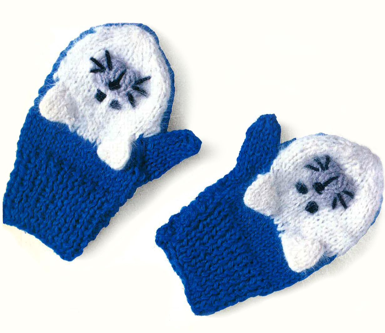 Tee taaperolle kissakaverit, jotka pitävät kädet lämpiminä. Lapaset neulotaan tasona kahdella puikolla, ja valkoiset kissat ovat pörrölankaa.