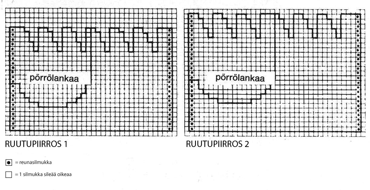 KUONO: Luo harmaalla 6 s ja neulo sileää oikeaa. Lisää kummassakin reunassa 1. ja 2. krs:lla 1 s. Neulo sitten kaikilla 10 s:lla 4 krs. Päätä kahdella seuraavalla kerroksella kummassakin reunassa 1 s ja päätä jäljelle jääneet 6 s.