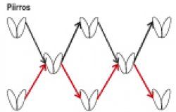 Kirjaile käänteeseen 3-kertaisella Isoveli-langalla (3 väriä yhdessä) kuvio kuvan ja piirroksen mukaan. Jätä pujotettavaa lankaa alkuun noin 15 cm roikkumaan, jotta siitä saa letitettyä palmikot. Lopeta kirjailu samaan kohtaan kuin aloitus. Pujota lisälankaa palmikkoja varten ja letitä noin 6–8 cm.