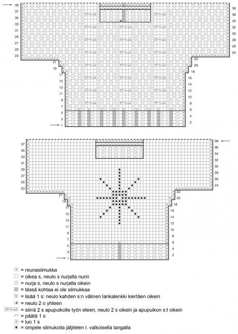Poimi hihansuusta 22 s ja neulo 5 krs joustinneuletta, päätä s:t. Tee toiseen hihansuuhun samanlainen reunus. Ompele silmukoita jäljitellen l.valkoisella langalla tähtikuvio etukappaleen keskelle piirroksen mukaan. Ompele vielä sivu- ja hihasaumat.