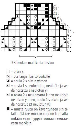 PITSINEULE: Neulo ruutupiirroksen ja oh-jeen mukaan. Piirroksessa on vain työn oikean puolen krs:t, neulo nurjalla kaikki s:t nurin.