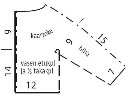 HIHAT: Luo ohuemmille sukkapuikoille 30 s ja neulo suljettuna neuleena ainaoikeaa 7 krs. Vaihda työhön paksummat sukkapuikot ja aloita sileä neule. Laita krs:n 1. s:n ympäri merkkilanka ja lisää tämän merkin molemmin puolin 1 s joka 3. cm 5 kertaa = 40 s. Kun hihan pituus on 15 cm, päätä hihan alapuolelta 7 s ja jätä loput s:t odottamaan. Tee toinen hiha samoin.