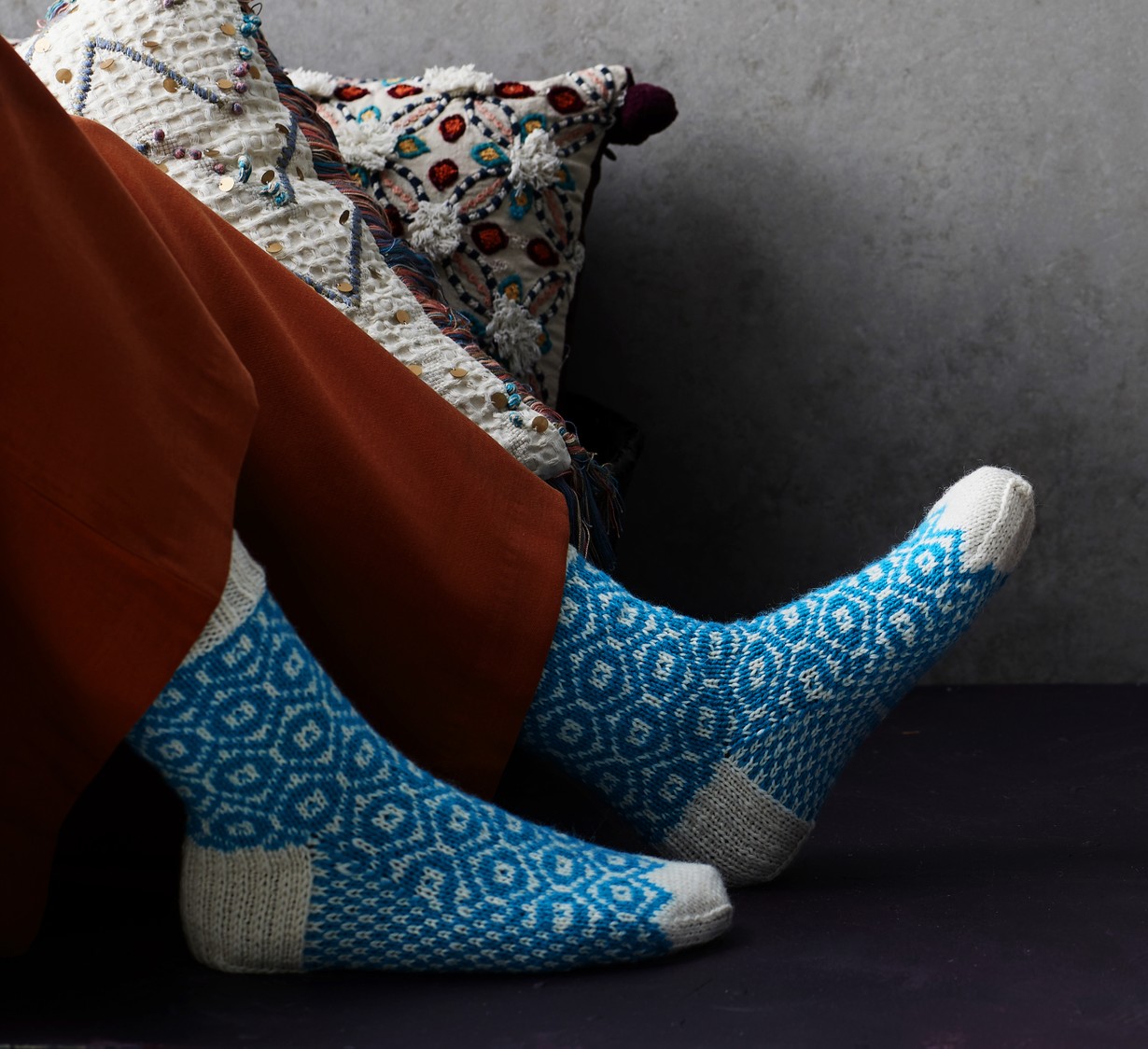 Itämaisiin maustetunnelmiin vievät kirjoneulesukat ovat yllättävän mutkattomat tehdä, sillä ruutupiirros jää helposti mieleen ja neuletta oppii lukemaan nopeasti.