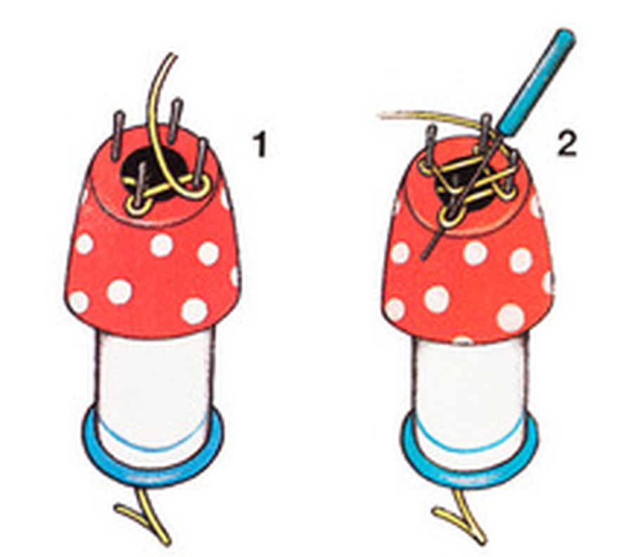 Kuva 2: Vie lanka ensimmäisen silmukan yli, pistä puikko ylhäältä alempaan silmukkaan ja nosta tämä irrallisen langan ja naulan yli. Neulo toinen, kolmas ja neljäs silmukka samoin. Jatka näin. HUOM: rullaa voi pyörittää kädessä joko myötä- tai vastapäivään. Neulo haluamasi pituinen nyöri. Katkaise lanka ja vedä langanpää silmukoiden läpi, kiristä.