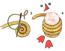 Kuva 4: Kierrä nyöriä edelleen munan muotoon, ensin suuremmaksi ja sitten pienemmäksi. Ompele jokaisella kerroksella nyöri kiinni. Täytä vanulla. Kun tipu on melkein suljettu, ompele nokka, silmät ja jalat paikoilleen. Leikkaa osat punaisesta tai keltaisesta huovasta, silmät sinisestä huovasta vaikka rei'ittäjällä. Ompele jalat alle niin, että varpaat näkyvät. Taita salmiakinmuotoinen nokka kaksinkerroin ja kiinnitä muutamalla pistolla keskeltä niin, että se jää auki. Kiinnitä silmät kuvan mukaan. Viimeistele ja päätä nyörin päät.
