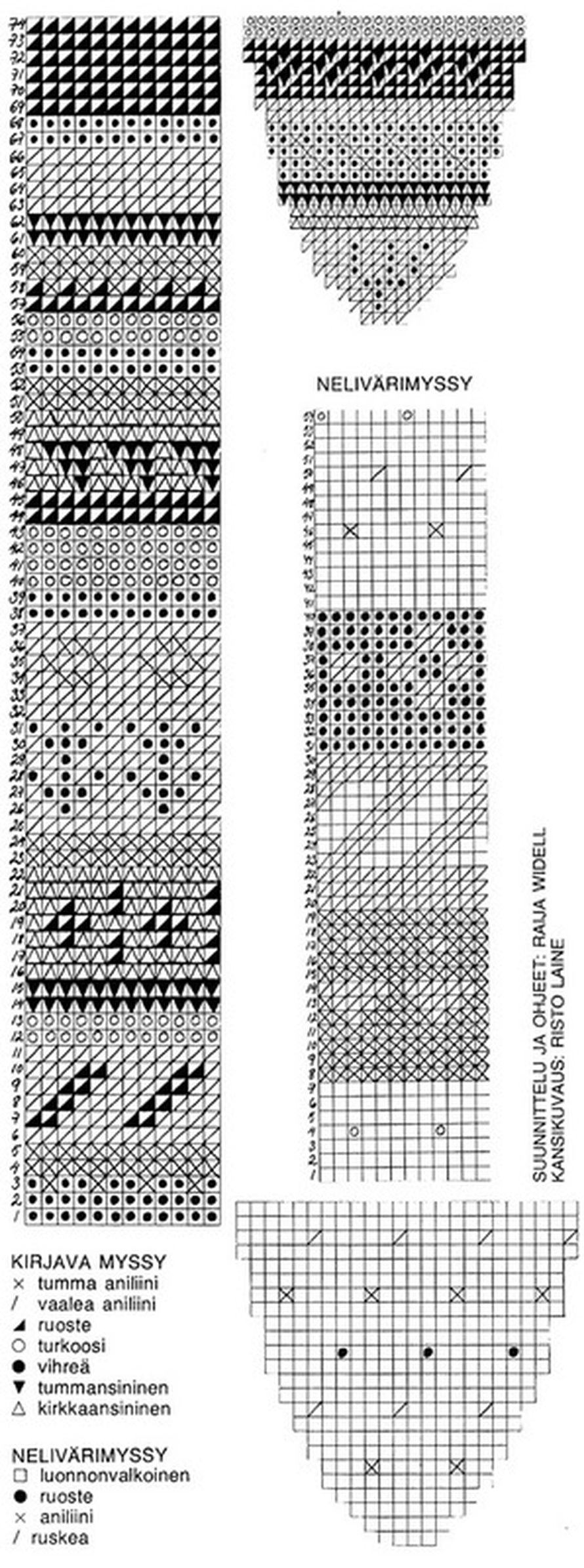 Tarvikkeet: 50 g luonnonvalkoista, 50 g jokaista 3 eri kuvioväriä: aniilinia, ruostetta ja ruskeaa Novita Wool, Alpaca tai Nalle-Iankaa. Sukkapuikot nro 4 ja suorat puikot nro 3½.
